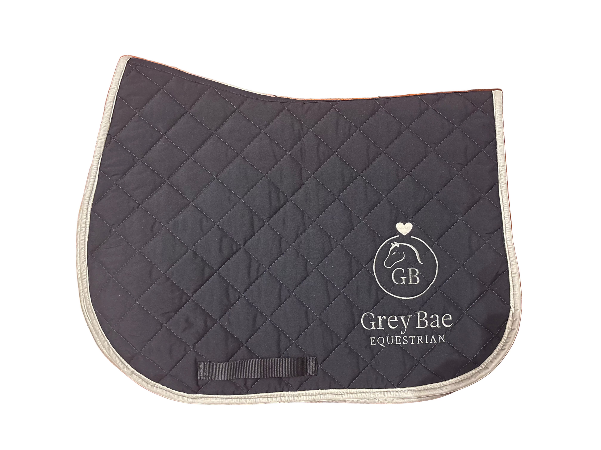 Add a splash of style to your ride with the Grey Bae Saddle Pad. Featuring navy and grey velvet on the sides and 100% embroidery, this pad combines comfort and creativity to keep your horse and your look on point. Perfect for those who love a playful twist in their equestrian gear!